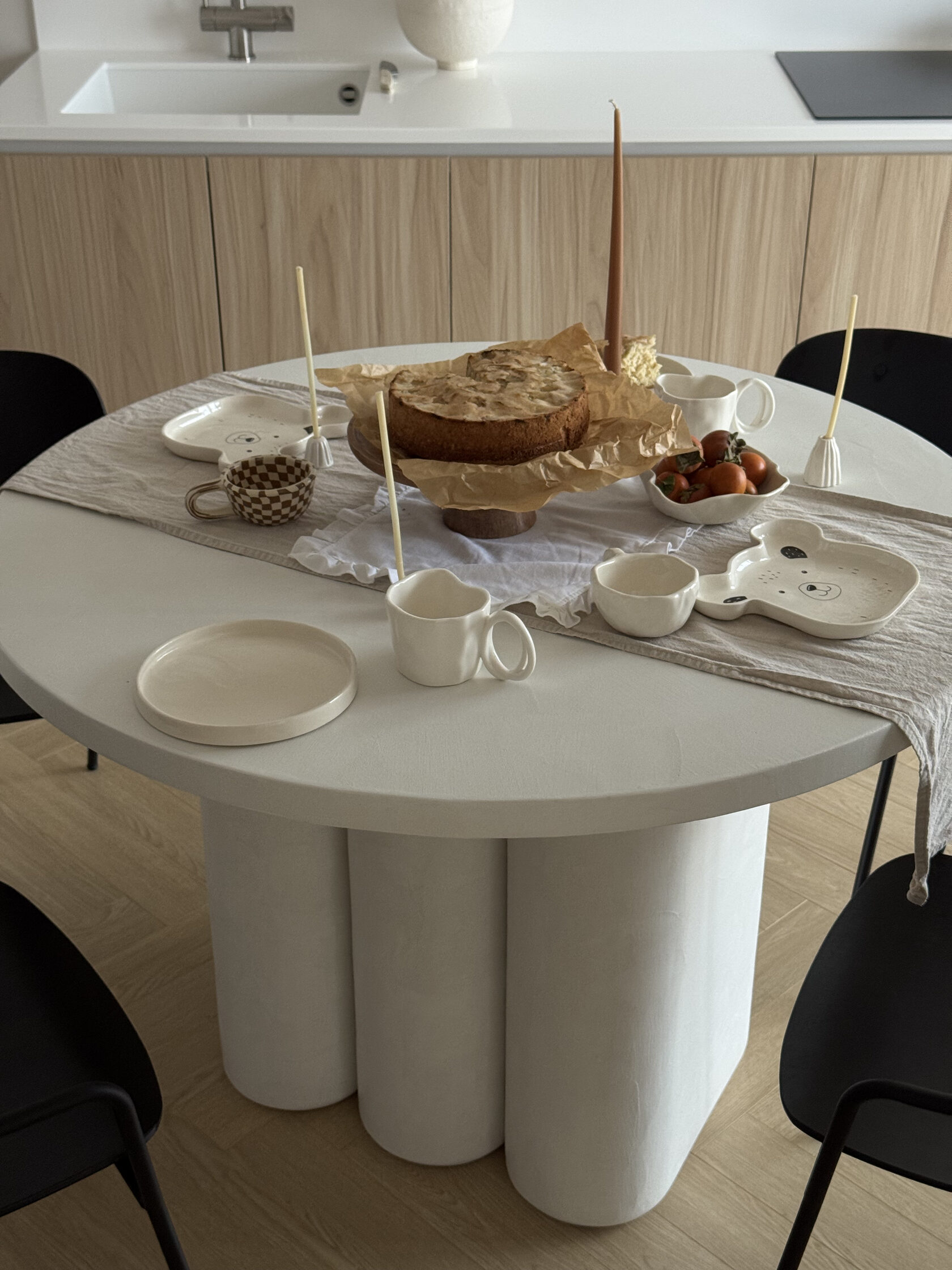 Комбинация бионических форм и бархатного узора микроцемента в столе Baz. По своей структуре данное покрытие напоминает камень и объединяет идеально выверенные ровные линии с природной небрежностью, свойственной камню.